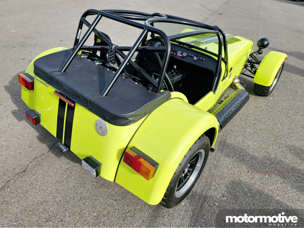 La gama Super Seven es la variante más clásica de Caterham, destacando estéticamente por sus pasos de rueda delanteros que se alargan descendiendo estilosamente sobre los laterales hasta la posición del conductor, así como por la rueda de repuesto situada a la vista en la parte trasera.